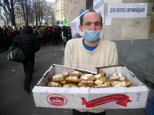 Так, среди вещей, нужных евромайдановцам – горячая еда, нарезка, сыр, хлеб, консервы, вода, кофе, печенье, конфеты, сгущенное молоко, фрукты и овощи. Согласитесь, что не каждая семья дома может позволить себе такой набор продуктов.
