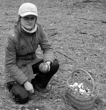 Становлюсь под красиво изогнутой сосной с раздвоенным стволом, чтобы сфотографироваться, и вдруг получаю чем-то сверху, что называется, «по куполу». С головы падает шишка. Задираю голову вверх и встречаюсь взглядом с возмущенными глазами-бусинками белки. Только теперь обращаем внимание на то, что под ногами кучи изгрызенных зеленых шишек. Сами того не зная, мы решили сфотографироваться прямо под беличьей столовой, и хозяйке это не понравилось. Она взлетает вверх по стволу и цокочет. Видимо, ругается по-своему. Оставляем ей за беспокойство семечек и уходим. Сфотографировать себя рыжая хозяйка леса, к сожалению, не дает. В дальнейшем видим белок еще два раза: они бесстрашно скачут прямо по кустам и по земле – тоже собирают грибы. А то как же – осень – горячая пора, идет заготовка продуктов на зиму. Потом эти грибы наколются на сучок и высушатся белками впрок.