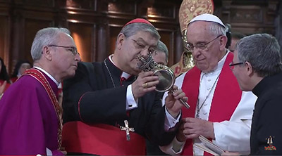 Во время мессы в кафедральном соборе Неаполя 21 марта главная реликвия храма – засохшая кровь святого Януария – стала жидкой после того, как капсулу с кровью поцеловал Папа Франциск. Соответствующее видео...