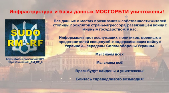 Хакери зламали веб-сайт Московського міського бюро технічної інвентаризації. При спробі відвідати ресурс висвічується повідомлення про те, що інфраструктура та бази даних Московського БТІ знищено, а деяку інформацію передано Україні.